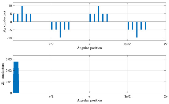 Conductors per air gap interval of a stator winding (top) and a rotor bar (bottom).