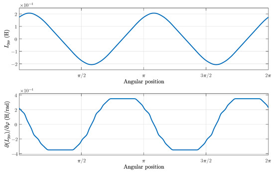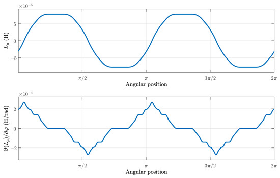 Applying the connection tensor (25) to the tensors of the primitive reference frame in (21), the machine tensors in the reference frame of Figure 6 are finally obtained for the healthy SCIM. Figure 16, top, presents the main inductance between a stator winding and a rotor loop in the reference frame of Figure 6, and Figure 16, bottom, presents its angular derivative, as a function of the rotor position.