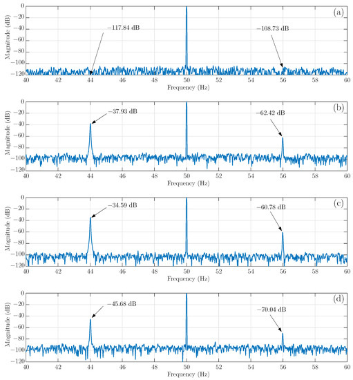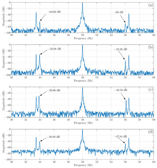 Spectra of the stator current obtained in the simulated tests of the motor of Appendix A with the following cage faults: (a) without fault, (b) one broken bar, (c) two consecutive broken bars (broken bars , ) and (d) two non-consecutive broken bars (broken bars , ). The main fault harmonics have been marked with text arrows, indicating their magnitude.
