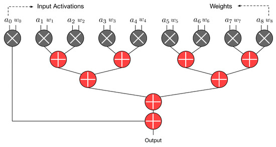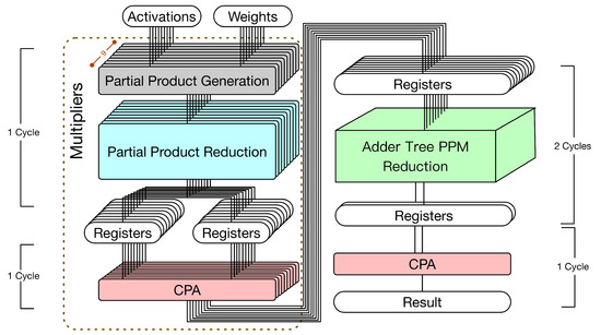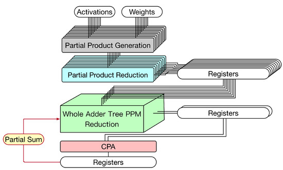- Tung, C.-W.; Huang, S.-H. A High-Performance Multiply-Accumulate Unit by Integrating Additions and Accumulations into Partial Product Reduction Process. IEEE Access 2020, 8, 87367–87377. [Google Scholar] [CrossRef]