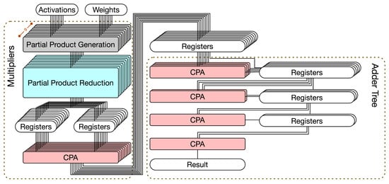 In fact, as described in [24], the adder tree can also be represented by a PPM. Then, we can apply the reduction tree algorithm to reduce this PPM. As a result, a lot of CPAs can be saved. According to this observation [24], we can derive the corresponding hardware circuit implementation as shown in Figure 4. Note that this state-of-the-art hardware circuit implementation (i.e., Figure 4) still includes two parts: multipliers and an adder tree. The details are elaborated below.