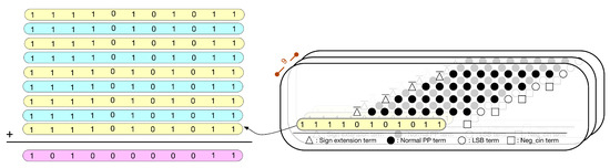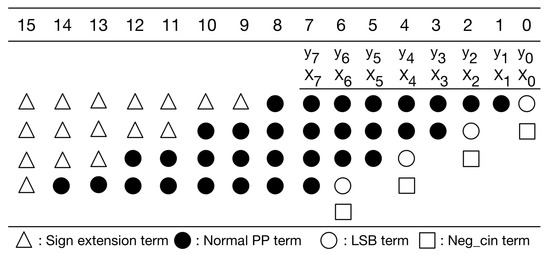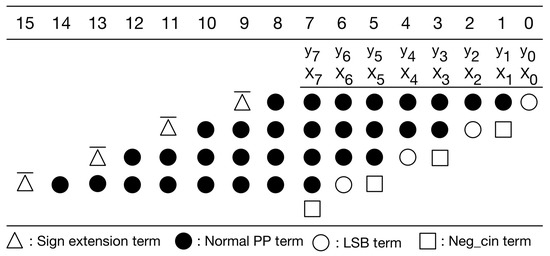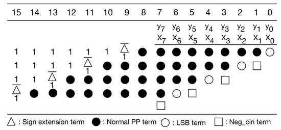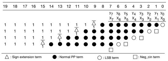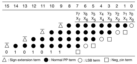 Our PPM is a modification to the typical PPM of radix-4 booth encoding [30]. Without loss of generality, here we use 8-bit multiplication as an example for illustration. Figure 6 gives the typical PPM of radix-4 booth encoding for signed 8-bit multiplication. As displayed in Figure 6, the typical PPM (of radix-4 booth encoding) includes signed extension terms, normal partial product (PP) terms, least significant bit (LSB) term, and negative carry-in (Neg_cin) terms. It should be mentioned that the Boolean expressions of these terms, including signed extension terms, normal PP terms, LSB terms, and Neg_cin terms, have been elaborated in [32]. Moreover, according to [30], we can modify the Boolean expressions of both LSB terms and Neg_cin terms, and then, we can move each Neg_cin term to one higher bit position, as shown in Figure 7. Compared with previous PPMs [30,32], this PPM (i.e., Figure 7) does have any accuracy loss. Note that our following discussions and optimizations are based on this PPM (i.e., Figure 7).