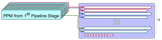 Then, in the second pipeline stage, we use the Dadda tree approach [23] to reduce the height of this PPM (as displayed in Figure 14) from 19 to 2. (In fact, both the Wallace tree approach [31] and the Dadda tree approach [23] can be used for the reduction of our PPM. Compared with the Wallace tree approach [31], the Dadda tree approach [23] uses fewer counters for the reduction of our PPM. Thus, we adopt the Dadda tree approach [23].) Note that the Dadda tree approach needs to perform the reduction process six times. (The maximum-height sequence is , etc. According to this maximum-height sequence, we know that the Dadda tree approach [23] needs to perform the reduction process six times to reduce the height from 19 to 2.) To reduce the clock cycle time, here, we use two clock cycles to complete the second pipeline stage (i.e., we use two clock cycles to reduce the height of this PPM from 19 to 2). After the Dadda tree approach is applied, the PPM is reduced to become two rows.