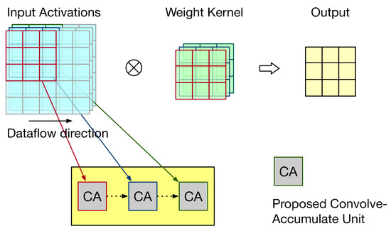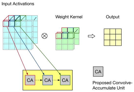 Thus far, we assume that the dataflow is weight stationary dataflow. In fact, the proposed CA (displayed in Figure 16) can also be used for input stationary dataflow. For input stationary dataflow, input activations are kept in the PE, and then, they are repeatedly used until all related computations have been completed. During processing, each PE sends the partial sum to its next PE for the accumulation of convolution results. The proposed CA (displayed in Figure 16) can be used as a PE in the systolic array to reflect this dataflow.