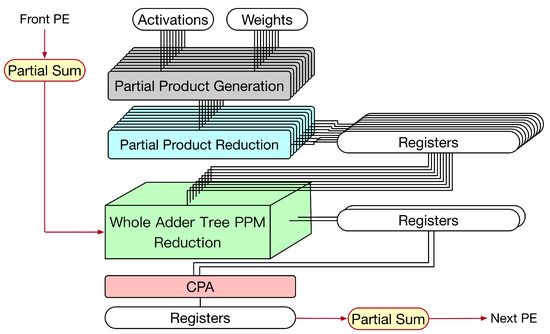 First, let us discuss the weight stationary dataflow. For weight stationary dataflow, weights are kept in the PE, and then, they are repeatedly used until all related computations have been completed. During processing, each PE sends the partial sum (i.e., the summation of its own convolution result and its front PEs’ convolution results) to its next PE for the accumulation of convolution results. Take the example shown in Figure 15 for illustration. In Figure 15, the convolution operation involves three channels and the systolic array has three PEs. Each PE stores one group of weights. Thus, each PE is responsible for the convolution of one channel. As the systolic array displayed in Figure 15, for each PE, its partial sum (i.e., the summation of its own convolution result and its front PEs’ convolution results) is sent to its next PE for the accumulation of convolution results. To reflect this dataflow, the PE needs to add its convolution result with its front PE’s partial sum. Thus, we say this PE is a convolve-accumulate unit (CA). Figure 16 gives the corresponding PE design, i.e., the corresponding CA design. As shown in Figure 16, for each PE, the partial sum of the front PE is treated as a partial product of its PPM in the second pipeline stage. (In fact, we can add the partial sum of the front PE and the pre-computed constant to become a single partial product (i.e., a single row). Then, the height of the whole adder tree PPM is still 19.) Therefore, for each PE, after the third pipeline stage is complete, its partial sum is produced.