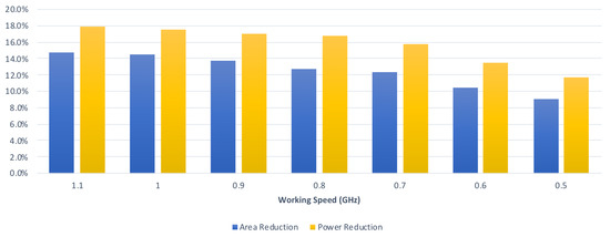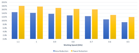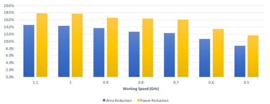 Finally, we perform an analysis of the relation between the reduction rate and the clock period constraint. From Table 2 and Table 3, we can derive Figure 19, which displays the average reduction rates of the proposed convolver design in the graphical form with respect to different clock period constraints. From Table 4 and Table 5, we can derive Figure 20, which displays the average reduction rates of the proposed CA-W design in graphical form with respect to different clock period constraints. From Table 6 and Table 7, we can derive Figure 21, which displays the average reduction rates of the proposed CA-O design in graphical form with respect to different clock period constraints. In Figure 19, Figure 20 and Figure 21, the blue chart and the orange chart denote the reduction rate on circuit area and the reduction rate on power consumption, respectively. We find that the reduction rate is inversely proportional to the working speed. The reason is that the critical path of the proposed approach is shorter than that of the state-of-the-art approach [24]. Thus, it is easier for the proposed approach to satisfy the clock period constraint. As a result, the proposed approach can achieve a higher reduction rate in a higher working speed. Note that high performance is the trend of CNN accelerators. Therefore, the proposed approach is promising.