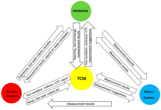 - The TCM system transmits to the process engineer diagnostic signals, work progress reports, and results of machining process supervision on a given cell (e.g., date/time of execution of individual operations, operator’s name, tool wear values after execution of individual operations, and information on occurrence of emergency situations (collisions and catastrophic tool failures).