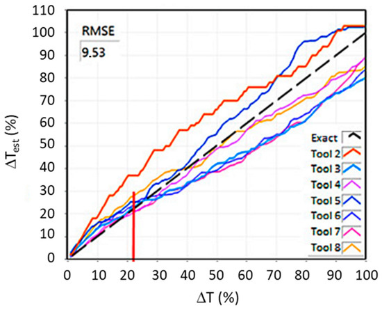 - Estimation of gradual tool wear (GTW). With a small number of operations in the life cycle, tool replacement may be necessary during operation. Thus, the algorithm must make a diagnosis about the state of the tool much more frequently than once per operation. An example of an algorithm that could be used here is the algorithm presented in [47]. Here, the tool wear diagnosis is presented up to 20 times per operation. Figure 4 shows the estimated tool wear using this algorithm for seven tools (from Tool 2 to Tool 8) and an ideal run (Exact). The tool wear rate presented by the system is used, here, as the used tool life ratio ΔT, which is an indicator that has long been used in tool condition diagnostics [48], shown in the figure as ΔTest versus actual ΔT. Currently, the more popular RUL (remaining useful life) ratio is derived from the ΔT ratio according to the formula RUL = 100% − ΔT. The estimation error by the ΔT algorithm is shown as the root mean square error (RMSE). The number of operations per tool life is from seven to ten, and the tool wear estimates are much higher. The solution performs well from about five operations per tool life. Further development of diagnostic algorithms should lead to even lower numbers of operations per tool life, even below one, because such cases also occur in the aerospace industry.