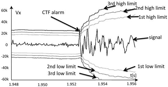 - Detection of catastrophic tool failure. The CTF must be detected in a fraction of a second, otherwise the workpiece may be damaged. The shorter the response time of the system, the lower the probability of this failure. For example, the algorithm developed in [50] can be used here. This algorithm can work based on force and/or vibration sensor signals. The latter is only effective with stable processing. Figure 6 shows how an algorithm like this works with the example of a vibration sensor signal. The waveform of the signal, the dynamic limits determined from the current dynamic component, and the additional coefficient obtained by the learning process are shown. The training can be performed on life periods of arbitrarily small number of operations. The CTF alarm is reported, here, less than 0.04 s after its occurrence. Further development of these algorithms should focus on eliminating the need to learn the system while being resistant to signal disturbances caused by changes in the cross-section of the machined layer or other reasons.