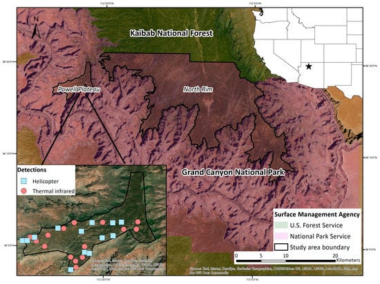 Location of study area and surface management agencies, Powell Plateau, and North Rim of Grand Canyon National Park, USA. Inset displays the location of bison group detections made by helicopter and thermal infrared surveys on Powell Plateau, 11 February 2020.
