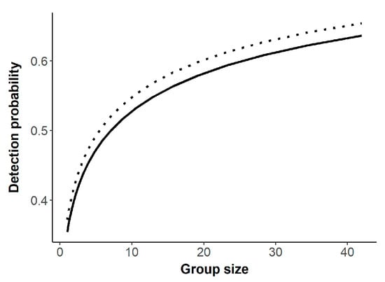 Detection probability as a function bison group size and presence of forested landcover type (solid = forested, dotted = not forested), North Rim of Grand Canyon National Park, USA, 2019–2021.