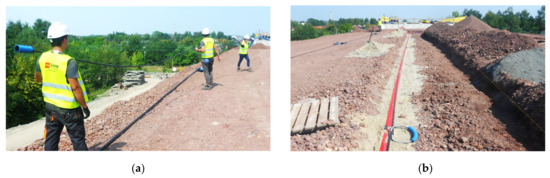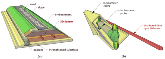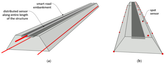 In the example section of embankment in Figure 1, which is 100 m long, three distributed sensors provide 30,000 measuring points (with spatial resolutions equal to 10 mm), while in the conventional approach, there are only several spot sensors or geodetic benchmarks. This enormous difference in the quantity and quality of obtained data is the reason why distributed sensing is nowadays finding a growing acceptance in laboratory, but above all, in field applications. What is more, it is possible to integrate linear DFOS sensors inside the structure during its construction [19,20,21] (or the production of precast structural members), which brings many benefits, including: