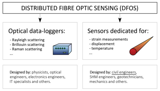 Distributed fibre optic sensing consists of two areas whose properties determine the efficiency and functionality of the entire monitoring system—Figure 2. The first area is related to optical data-loggers (e.g., reflectometers or interrogators), which allow one to perform measurements of selected physical quantities (usually strains or temperatures [23]). The basic measurement principles involve light scattering: Rayleigh [24], Brillouin [25,26,27] or Raman [28]. Each technique is characterized by its own advantages and limitations, and the final selection should depend on the requirements of a given project. For instance, the Rayleigh-based system provides extremely high spatial resolution [29,30] starting from as fine a width as 5 mm, which allows for the detection of localized damages [31] such as cracks within concrete structures [32]. What is more, dynamic, real-time measurements are also possible [33] with a spatial resolution starting from 0.6 mm. On the other hand, Brillouin systems enable measurements over very long distances (up to hundreds of kilometres) to monitor linear structures and identify extensive damages, such as leakages in hydrotechnical structures, including pipelines.