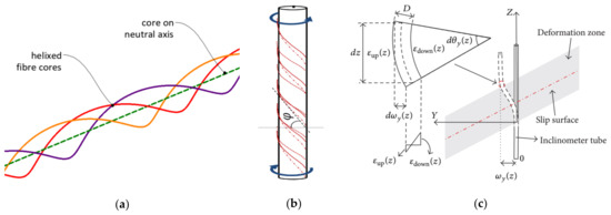 Figure 3. Example optical solutions for displacement measurements: (a) helical multicore fibre; (b) set of three standard optical fibres in appropriate arrangement [41]; (c) mathematical model illustrating the principle of fibre optic inclinometer for horizontal displacements [42].- Rod with spiral optical fibre arrangement—Figure 3b [41];
