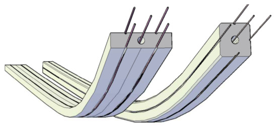 The final step of the research process was to physically create the sensors, which can be ready-to-use in real case studies, both in the laboratory and field conditions. The task was accomplished by setting up a production line in which optical fibres are permanently and precisely integrated into the composite core during the pultrusion process [47]. The core of the sensor has a very low elastic modulus (≈3 GPa) and very high strain range (±4%). The standard dimensions of the field version of 3DSensor are 50 × 15 mm. However, the geometry and physical properties of the senor’s core can be freely modified to meet the requirements of specific projects. Two typical versions were proposed and produced: