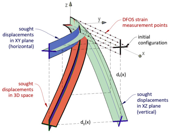 - Mathematical–physical models [42,43] (Figure 3c), allowing one to calculate displacements based on the results from appropriate arranged strain sensors–Figure 4 [41].