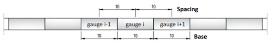 Figure 7. Parameters of distributed fibre optic strain measurements (both gauge’s spacing and measuring base set to 10 mm as an example) [45]. - Displacements are calculated in the same fixed points defined by spatial resolution such as in the case of strain measurements (values are linearly interpolated between the points in their simplest terms).