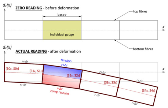 The above method is based on the discretization of the sensor according to applied spatial resolution, creating the chains of individual gauges, which are rectangular at initial configuration (during zero reading)—Figure 8. For further clarity of presentation, analysis is be presented only for the vertical plane XZ, involving the bottom and top optical fibres. Data processing in the horizontal plane XY is analogous, but based on the right and left fibres.