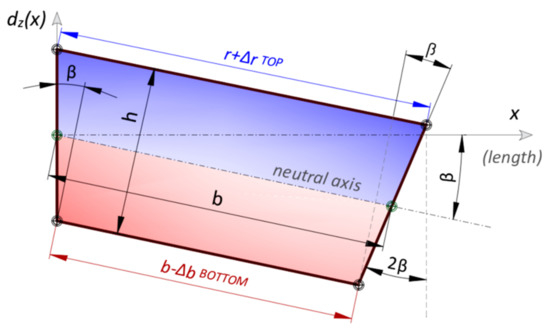 The rectangular shape of the gauges after deformation are changed into trapezoid (Figure 9) and further analysis is focused on its geometry. That is why the proposed method is also called the trapezoidal method. Elongations or shortenings of the gauge bases are calculated knowing the measured strains in optical fibres and using the engineering strain definition: