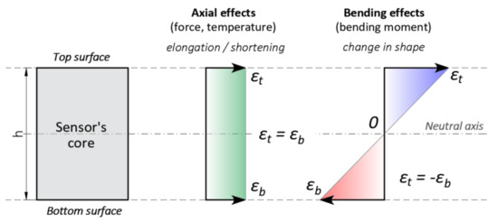 Deformation related the change in the shape of the sensor generates strains within the bottom and top optical fibres. Assuming a statically determined scheme and no presence of axial effects, the absolute values in tension and compression at opposite surfaces of the sensor core will be equal. The influence of axial effects, including force or temperature, are discussed in Section 2.3.