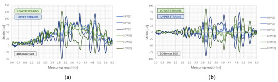 Having strain measurements on both sides of neutral axis, it is possible to distinguish between axial and bending effects and remove the constant (axial) part. The example of such analysis is presented in Figure 11 based on the practical application of 3DSensor in geotechnical research [46]. Figure 11a shows raw strain data from both lower and upper fibres of 3DSensor at selected load stages, without any compensation. Raw data are influenced by bending, the axial force and thermal actions. On the other hand, Figure 11b shows strains resulting only from bending, where axial actions are removed. Absolute values on both sides are now consistent and correspond to theoretical predictions (Figure 10).