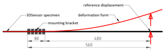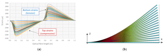 The first test involved short-length sensor specimens analysed in a cantilever scheme—Figure 13. One optical fibre was installed within the lower (tensile) and the upper (compressed) surface, so that the raw strain data are presented within the single plot—Figure 14a. Displacements were applied using a screw mechanism, which was controlled through electronic micrometre with the measurement resolution of ±0.001 mm and accuracy of ±0.005. Reference micrometres were used for error analysis while calculating vertical displacements. However, the nonlinear effect of shortening the specimen over the horizontal axis x was also investigated and compared to the results from finite element analysis (FEA). The model (Figure 14b) took into account nonlinear behaviour of the element by applying third order theory.