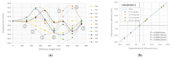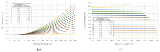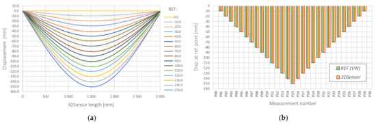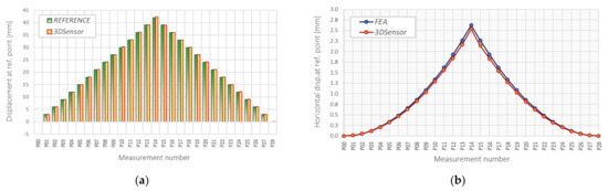 Based on strain data obtained with 10 mm spatial resolution, vertical displacements (Figure 15a), as well as horizontal shortenings over x axis (Figure 15b) were calculated for different values of vertical displacements (up to 42 mm). The obtained results are summarized in Table 3 with comparison to reference techniques: