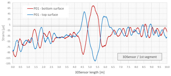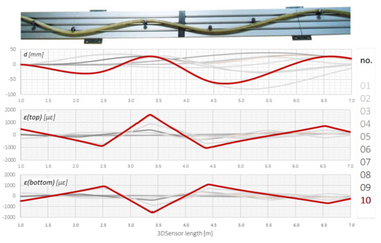 Data from distributed fibre optic displacement sensor were analysed with 10 mm spatial resolution, which means 100 measuring gauges along 1 m of 3DSensor. Analysis was only focused on vertical displacements. The obtained raw strain data were averaged from two bottom fibres and two top fibres to increase the final accuracy, and they are presented in Figure 26. Only the first 10 m of the sensor is shown to present the operation rule and keep appropriate clarity of the drawing. It can be noticed that the sensor was subjected both to the bending and axial actions related to force and temperature changes. However, only bending effects are responsible for changing the shape of the sensor.