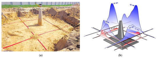 - Geotechnical research field [46], where different types of concrete footings design for electrical lines were pulled out from the ground for researching the shear plane. Figure 28a shows the installation process, while Figure 28b shows an example spatial visualization of displacement profiles obtained at a given load step;