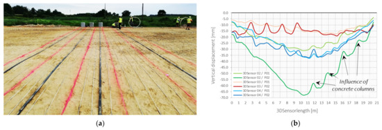 Figure 29. Embankment above the substrate strengthened with concrete columns: (a) 3DSensors’ installation; (b) example measured displacement profiles with visible influence of concrete columns. - Gas pipeline. Sensors were delivered in coil (Figure 30a), unrolled and installed along the entire 180 m length at designed positions (Figure 30b);
