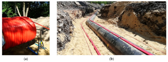 Figure 30. Gas pipeline equipped with 3DSensors: (a) delivery on site in the coil; (b) view of the installed sensors. - Composite bridge panel [45], where during the infusion process, optical fibres were integrated with lower and upper laminates with the same idea as in the 3DSensor. Figure 31a shows the spatial visualization of designed panel, while in Figure 31b, the ready structure just before laboratory investigation is shown.