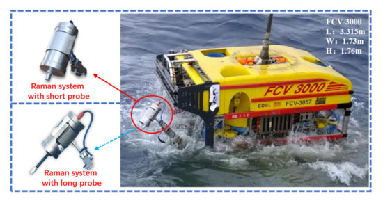 In recent years, the attempt of applying Raman spectroscopy to marine geochemical detection has achieved satisfactory results. Since the first deep ocean Raman in situ spectrometer system (DORISS) was reported in 2004 [1], researchers have established several underwater Raman systems and applied them to different in situ detection scenarios. The typical instruments include the upgraded DORISS II developed by Monterey Bay Aquarium Research Institute (MBARI) [2], the hybrid Raman insertion probe (Rip) developed by the Institute of Oceanology Chinese Academy of Sciences (IOCAS) [3], and the underwater Raman systems independently developed by the Ocean University of China (OUC) and the French Research Institute for Exploitation of the Sea (IFREMER) [4,5,6,7,8]. These systems have been deployed on ROVs for in situ detection of sediment pore water [9,10], deep-sea minerals [11,12], bacterial mats [13], methane hydrates [14,15,16], and the fluid of hydrothermal vents or cold seeps [17,18].