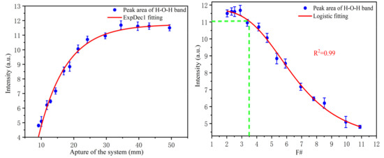 In this system, we used a beam expander to enlarge the system aperture from 25.4 mm to 50.8 mm to increase the sampling point density and reduce the measurement error. At the same time, a tunable iris was used to change the system aperture and keep the focal length constant (100 mm). This tunable iris can continually change the aperture from 9 mm to 50.8 mm so that the experiment system can operate in the F/# range from 2 to 11. We chose the peak area of the H–O–H bending band (1640 cm−1) as the index to measure the spectral intensity because this peak is not sensitive to external factors and is often used as an internal standard for the quantitative analysis of solute in water. Furthermore, we converted the aperture value to F/# according to Equation (1). The result is shown in Figure 4.