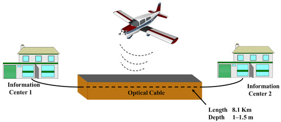 The field experiment was conducted near an airport in Qinhuangdao using the city’s underground fiber-optic cable between two information centers as the sensing unit. The fiber-optic cable was buried in the subsurface at a depth of 1–1.5 m and the length used in this experiment was 8.1 km. The experimental scenario is shown in Figure 2. The satellite map of the experiment area is shown in Figure 3.