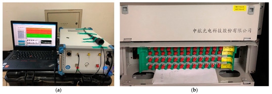(a) The hardware and software of the Φ-OTDR system; (b) The sensing fiber-optic cable distribution frame.