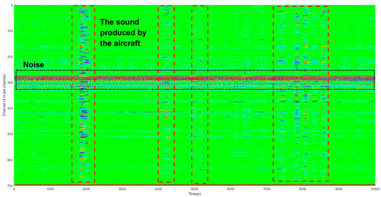 The data supporting this study was collected from 12 October to 13 October 2020. The original signal was recorded as the aircraft flew over the fiber-optic. The sound produced by the aircraft propagates to the ground, which in turn makes occasional contact with the surface and is recorded by the fiber-optic buried in the shallow ground. There was a lot of background noise on the urban surface, such as noise caused by moving vehicles and mechanical operations. We selected 700 channels that are well-recorded to display the sound produced by the aircraft.