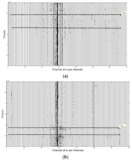 In approximately channel 300, there is a strong noise induced by vehicles that with a similar frequency distribution to the airplane signal. Therefore, it cannot be eliminated from the original signal by the Chebyshev lowpass filter. We obtained a good denoising result in other channels, as shown in Figure 8c. The SNR is defined as a voltage ratio between the peak of the disturbing signals (S) and the fluctuant range of the noises (N) with the equation of 20 lg(S/N). The SNR of this signal before filtering was 25.9 dB and raised to 48.8 dB for the proposed method.
