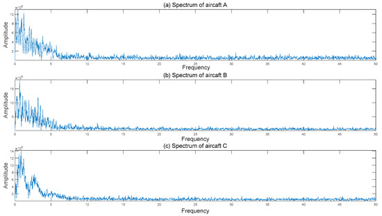 Three aircraft were selected as a sample to analyze the frequency domain of the signal. The frequency distributions of the signals are shown in Figure 7.
