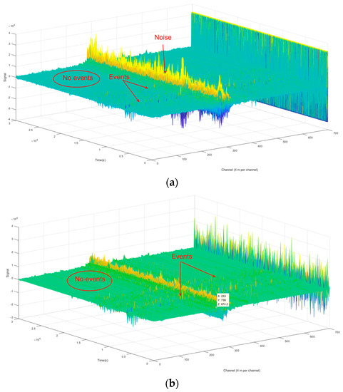 For a typical Φ-OTDR system, as shown in Figure 1, the vibration signal causes phase changes of backscattering light at locations detected by the photosensitive device [25]. The locations of the vibration signals are determined by the return time of the backscattering light.