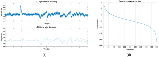 (a) Multi-channel signal before filtering; (b) Multi-channel signal after filtering; (c) Single-channel signal before and after filtering; (d) Pass-band curve of the filter.