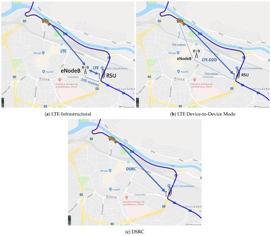 In the simulation study presented here, we measured the average Packet Delivery Ratio (PDR) and average end-to-end delay of Vehicle-to-Infrastructure (V2I) communication in an urban scenario in which vehicles communicated with a Roadside Unit (RSU) located at an intersection in the city of Zilina (averaged over all of the communication sessions realized in the corresponding simulation runs); see Figure 1 for more details. In the first simulation scenario, the V2I communication was carried out by an LTE network consisting of an eNodeB placed 200 m from the RSU at the intersection. All of the vehicles, as well as the RSU, were wirelessly connected to the same cell by using the Uu interface and E-UTRA Operating Band 65 [18]; see Figure 1a for more details. The network topology of the second simulation scenario (see Figure 1b for more details) was similar, except for the fact that the communication in this case was carried out with the LTE Device-to-Device (D2D) Mode 3 [19]. The payload packets were transmitted directly from the vehicles to the RSU. So, the eNodeB just oversaw the network and managed a scheduling process for the communication resources, but did not take part in the transmission of the payload. In this case, because the eNodeB did not provide data connectivity to the RSU, it was moved closer to the road segment from which the vehicle flow in order to facilitate the signaling of the resource selection to the transmitting vehicles more reliably. The communication in the third scenario (see Figure 1c for more details) was based on the DSRC technology. The vehicles and RSU formed an ad hoc network that included the PHY and MAC layers, as defined in IEEE 802.11p [20].