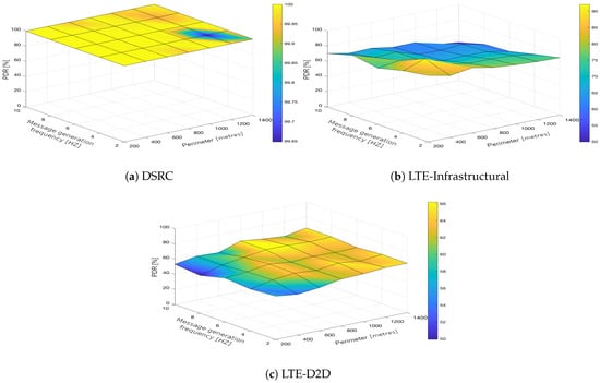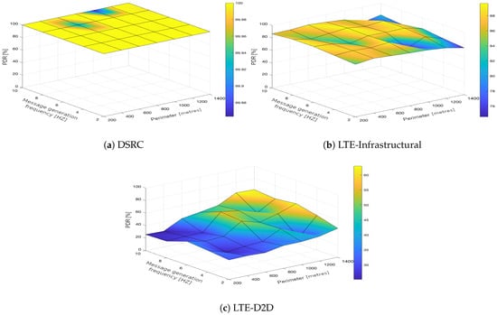 In the upcoming subsections, the results are presented and compared. In particular, the PDR results are presented in Section 3.1, graphically illustrated in Figure 2, Figure 3, Figure 4, Figure 5, Figure 6 and Figure 7, and the end-to-end delay results are described in Section 3.2, graphically illustrated in Figure 8, Figure 9, Figure 10, Figure 11, Figure 12 and Figure 13. In both cases, we benchmarked the DSRC, LTE-Infrastructural, and LTE-D2D (mode 3) technologies with different traffic intensity values from the perspective of the communication perimeter and message generation frequency. Finally, the results obtained were put into the context of the networking and connectivity requirements of the most popular V2I services.