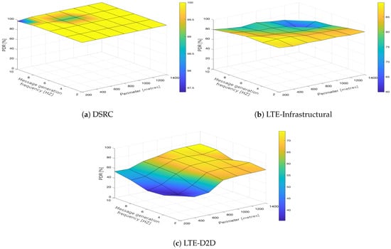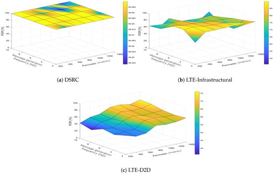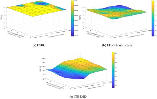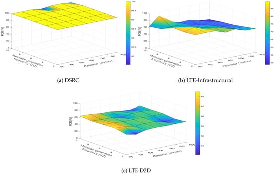 In the LTE-D2D case, the behavior was quite different (Figure 2c, Figure 3c, Figure 4c, Figure 5c, Figure 6c and Figure 7c). The increased value of the perimeter caused a higher PDR. This was also the case for the higher message generation frequency, except with the communication perimeter of 200 m. The best results were achieved for the combination of the greater perimeter and higher message generation frequency. This sounds rather unintuitive at first glance; however, the reason for this behavior lies in the topology of the communication network. On one hand, with a decreasing perimeter, the communicating vehicle is closer to the RSU. On the other hand, its distance from the serving eNodeB increases, which results in less reliable resource scheduling for the transmitting vehicles, and collisions start to occur. Hence, the simulation results suggest that in the case of the LTE-D2D mode 3 communication, the distance between the transmitter and the eNodeB might have an even greater impact on the PDR than the distance between the transmitter and receiver.