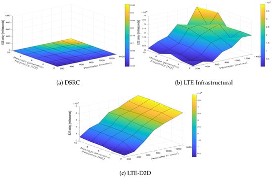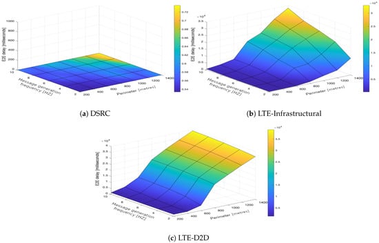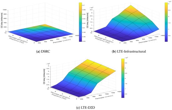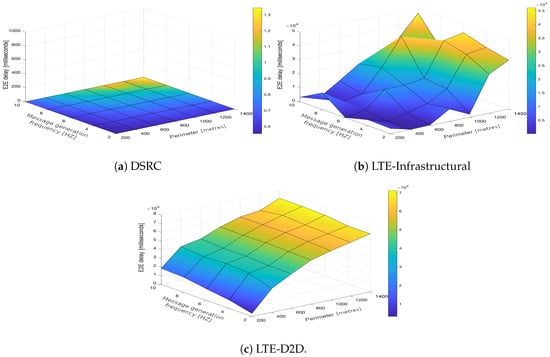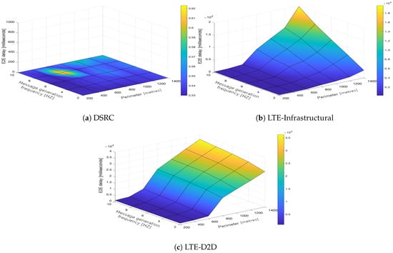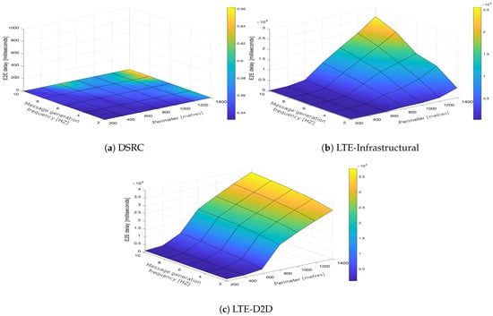 It is worth reiterating here that the presented values represent the average delay, i.e., averaged over all communication sessions realized in the corresponding simulation runs. Similarly to with the PDR, the DSRC also obtained much better results when it came to the end-to-end delay (Figure 8a, Figure 9a, Figure 10a, Figure 11a, Figure 12a and Figure 13a). With increasing values of the message generation frequency and communication perimeter, the delay also increased. Naturally, the lowest delay values were reported for the lowest values of the perimeter and message generation frequency. Moreover, decreasing traffic intensity led to better values of the delay, especially for higher values of the perimeter and message generation frequency. For both LTE modes, i.e., LTE-Infrastructural (Figure 8b, Figure 9b, Figure 10b, Figure 11b, Figure 12b and Figure 13b) and LTE-D2D (Figure 8c, Figure 9c, Figure 10c, Figure 11c, Figure 12c and Figure 13c), the behavior was the same as that reported for the DSRC. So, the delay values increased with the increase in the perimeter or frequency of the generated messages. Regarding the traffic intensity, the trend was again the same as that reported for the DSRC. Please note that the values of the average end-to-end delay were approximately four orders of magnitude lower in the case of the DSRC than for both LTE-based technologies.
