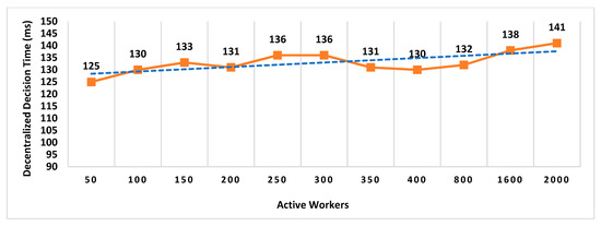 All concurrent requests are generated in less than 1 s on the same supervisor node to see the impact on decentralized decision time. In Figure 12, the “Request Interval” is the duration within which all requests are received by RRSN. For example, five concurrent requests are received by RRSN within 28 milliseconds, and 100 concurrent requests are received within 920 milliseconds. Against each request, RRSN performs the following tasks: (i) broadcasts the location proof request to the admin layer to initiate the distributed consensus against each request; (ii) computes the co-located workers for the prover; (iii) validates the confirmations received against each proof and waits until the consensus threshold is achieved against each request; (iv) generates a decision block once consensus is established on the same workers for the prover against an individual request; (v) broadcasts the decision block to the admin layer to make it part of a decision blockchain; (vi) sends the approval message, including the decision block ID against the individual proof request, to the prover, selected location authority, and witness. Therefore, Figure 12 can give an insight into the impact of concurrent requests load on a single supervisor node, and we can see the degradation of performance from results. Hence, we need to re-evaluate the protocol to identify the improvements for reducing the impact of concurrent requests within a short interval on a single supervisor node.