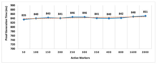 Another important factor determining the performance of the MobChain is the number of concurrent requests to supervisor nodes by provers. To see the impact of concurrent requests on performance when all requests are received by the same supervisor node, we performed the tests by keeping the number of supervisor nodes in the admin layer constant; i.e., 15; the number of active workers is 1600, and the consensus threshold is 8 with an ECC key size of 224. The results of the experiment are plotted in Figure 12.