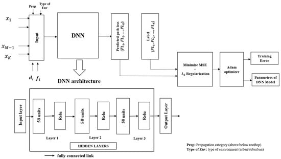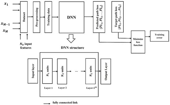 A fully connected MLP DL model is a fully linked network in which all neurons at a certain layer are connected to all neurons of the following layer. This network contains dense layers including one input layer, several hidden layers, and one output layer. The process of training path loss dataset with the proposed DNN model is illustrated in Figure 1.