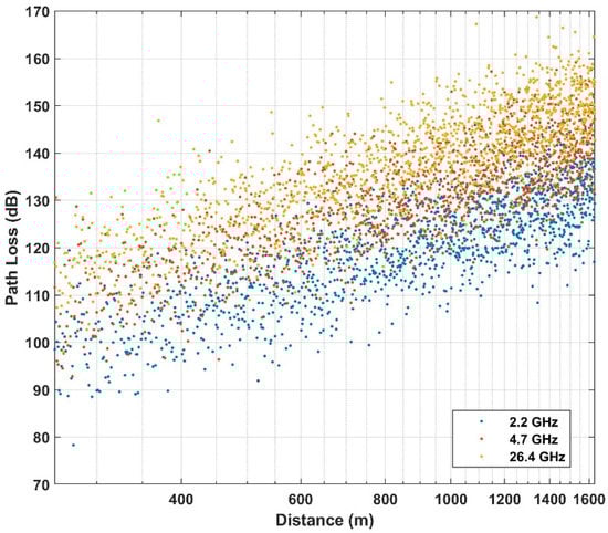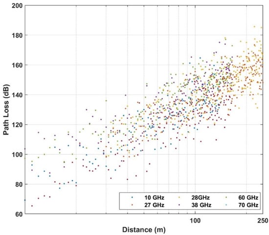 The ABG path loss model and DNN path loss model are further compared in three cases including low 5G frequency band (under 1 GHz), mid 5G frequency band (1 GHz to 6 GHz), and high 5G frequency band (6–100 GHz) [41]. In Figure 10, low 5G frequency band with , DNN model shows its ability to follow the distribution of the data (as highlighted in orange in red circles) while ABG path loss model cannot capture the distribution of the data around the mean ABG path loss.