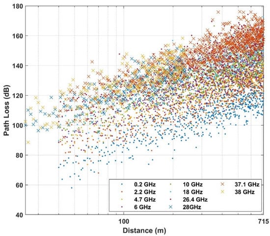 Below the rooftop is a scenario where both transmitter and receiver are under the height of the surrounding rooftop; meanwhile above the rooftop is a scenario in which one base station (transmitter or receiver) is above the surrounding rooftop and the other is under the surrounding rooftop. In this paper, the path loss dataset is considered in the case of NLOS, in both above rooftop and rooftop scenarios and in both urban and suburban environments. The number of measured frequencies is 13 which are presented by elements of a vector of frequencies in with frequencies includes values in . The data set is summarized in Table 1 and shown in Figure 2, Figure 3 and Figure 4 based on different environments.