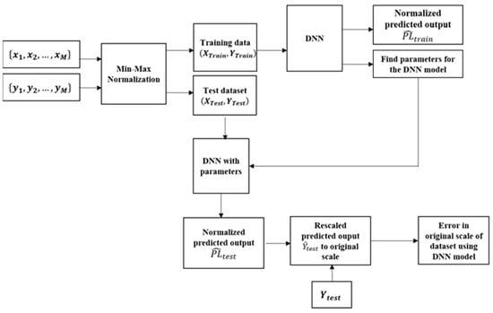 The dataset needs to be pre-processed before training by the DNN model as each input sample contains different features e.g., distance and frequency data have a range of different scales, therefore differences in scales can lower the performance of prediction at the output of the DNN model. The performance of the model can be improved using normalization. The process of processing data through the DNN model is demonstrated in Figure 5. Firstly, the whole dataset is randomly split into two groups of training (80%) and testing (20%). Here, the testing set is put separately to evaluate the generalized performance of the DNN model, and test set should be seen one time after the training process.